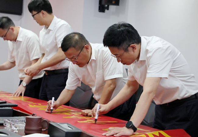 各参建单位领导就下一步“安全生产月”工作重点依次进行表态发言。现场全体建设者代表进行“安全宣誓”,并在安全月横幅上签字。