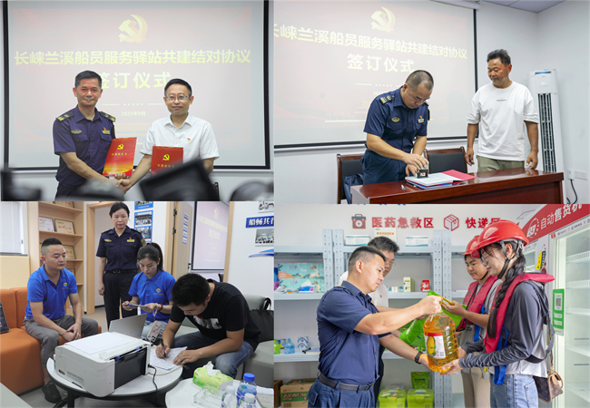 胡学东、程旭、李卫超、巩劲松共同为长崃兰溪船员服务驿站揭牌。活动还进行了签署第一份协议、申领第一本证书、寄出第一单快递、购买第一单物资、申报第一单培训等仪式,对长崃公司、海事处、水上公安、船员、高质学校等单位代表采访。