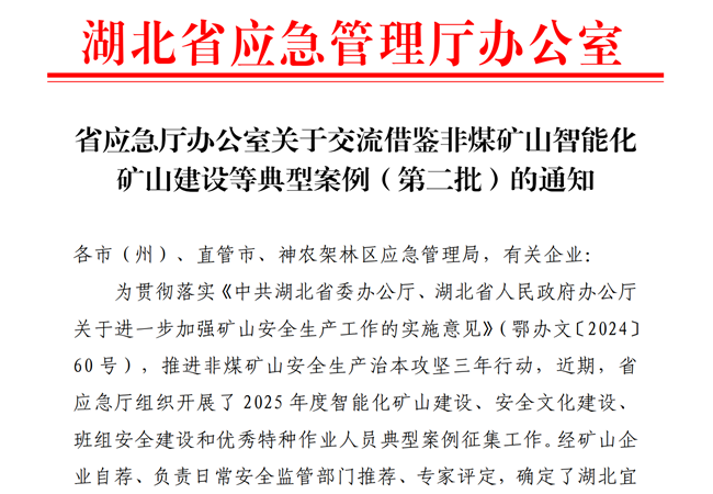 近日,湖北省应急管理厅办公室发布《关于交流借鉴非煤矿山智能化矿山建设等典型案例(第二批)的通知》,湖北长崃公司被确定为全省非煤矿山智能化矿山建设典型单位。这一荣誉的获得,标志着湖北长崃公司在智能化矿山建设领域取得阶段性重要成果。