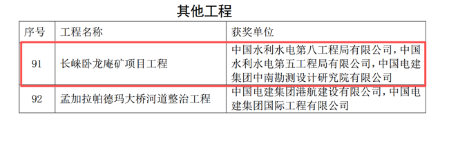 铸就行业标杆 彰显卓越实力——湖北长崃公司卧龙庵矿项目工程荣膺“中国电建优质工程奖”