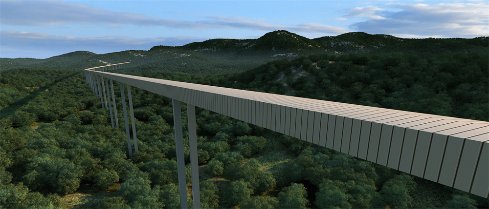 长胶廊道是项目产品输出的生命线,总长6.1km,其中隧洞总长约3.2km。起点位于砂石工厂成品堆场,沿西南方向依次跨越G45高速公路、G347国道等区域,最后到达码头陆域堆场。长胶廊道设计运输能力11000t/h,带宽2.2m,带速5.6m/s,单线单条布置。长胶廊道采取全线封闭,配备降噪、除尘等措施,可最大限度降低对周边环境和社会环境的影响。