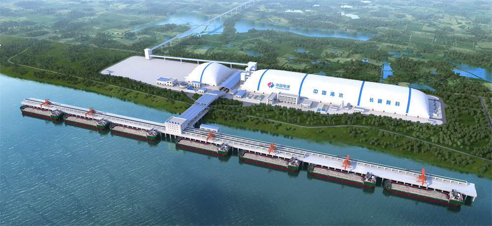 码头工程位于矿山西南方向,是项目产品外销的关键渠道,由现代化、智能化的水域码头平台和陆域堆场组成。码头陆域配套建设相应的堆场、碎石水洗系统等生产设施,占地约275亩。堆场采用气膜结构封闭,总容积为约51万m³,仓内成品骨料分五种粒径堆存,由带式输送机运至码头装船。水域使用岸线903m,结构型式为高桩梁板式,建设7个5000t级(水工结构按靠泊10000t级船设计)散货泊位,配置6台2500t/h的直线轨道式装船机,设计年通过能力达4120万t。具有适应长江航运船舶规模化、大型化的发展需求,集约高效利用岸线资源、节能减排、智慧化运营等优势。